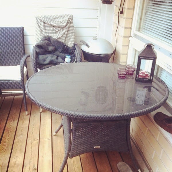 Vuosi sitten elokuussa meidän parveke lasitettiin ja se osaltaan mahdollisti tämän uudistuksen. Materiaaleissa saisi suosia enemmän kankaita kun parvekkeelle ei enää sada vettä eikä roskia, myös tuulelta ollaan suojassa. Kun lähdimme uudistamaan sovittiin ettei budjetti saisi olla paljoa sataa euroa enempää, sillä samaan aikaan olkkari koki mullistuksia (niistä myöhemmin !). Myimme vanhat massiiviset polyrottinki kalusteet vanhemmilleni ja sen myötä saatiin kätevästi pääoma kesähuoneen makeoveriin. Vanhasta parvekkeesta jäi ainoastaan tuo tekopuu ruukkuineen sekä grilli, muuten kaikki saisi mennä uusiksi.